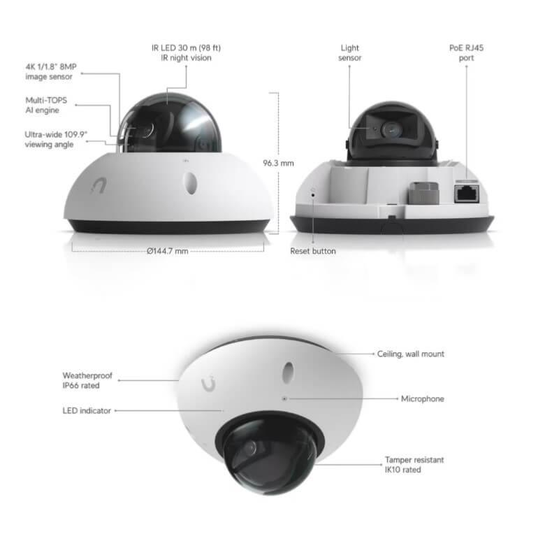 Caméra dôme réseau 4K 8 mégapixels pour l'extérieur IP66, managée par l'application UniFi Vidéo, vision jour/nuit IR 30 mètres, lentille fixe, audio, moteur IA, alimentation PoE. Boitier blanc