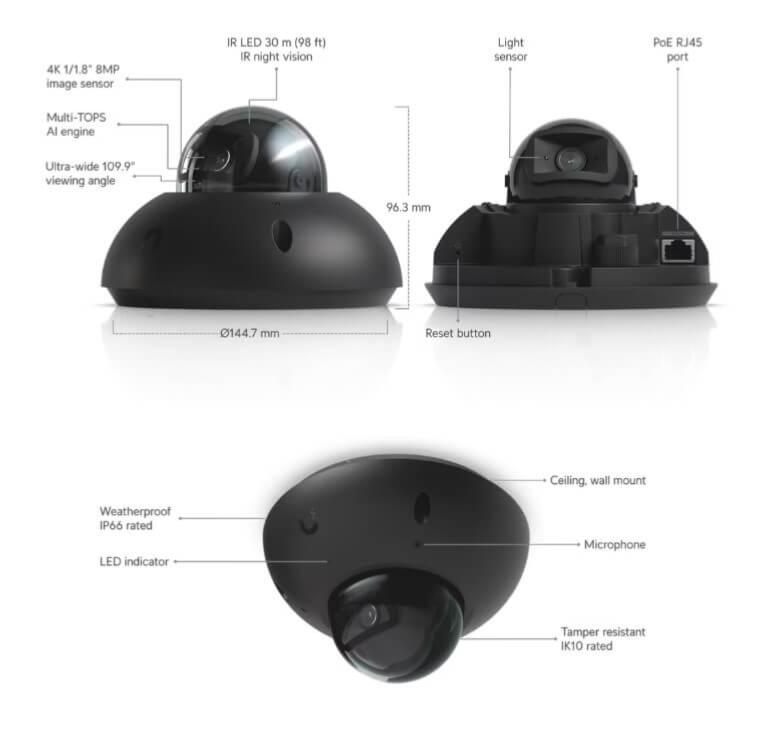 Caméra dôme réseau 4K 8 mégapixels pour l'extérieur IP66, managée par l'application UniFi Vidéo, vision jour/nuit IR 30 mètres, lentille fixe, audio, moteur IA, alimentation PoE. Boitier noir