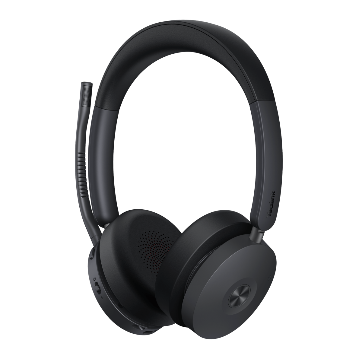 Casque téléphonique stéréo confortable avec 2 oreillettes en simili cuir, audio avec ANC, autonomie jusqu'à 32 H, connexion Bluetooth jusqu'à 50 m. Livré avec dongle BT51, câble USB-A/C. Pour communications unifiées, certifié pour Teams. Livré avec support de charge