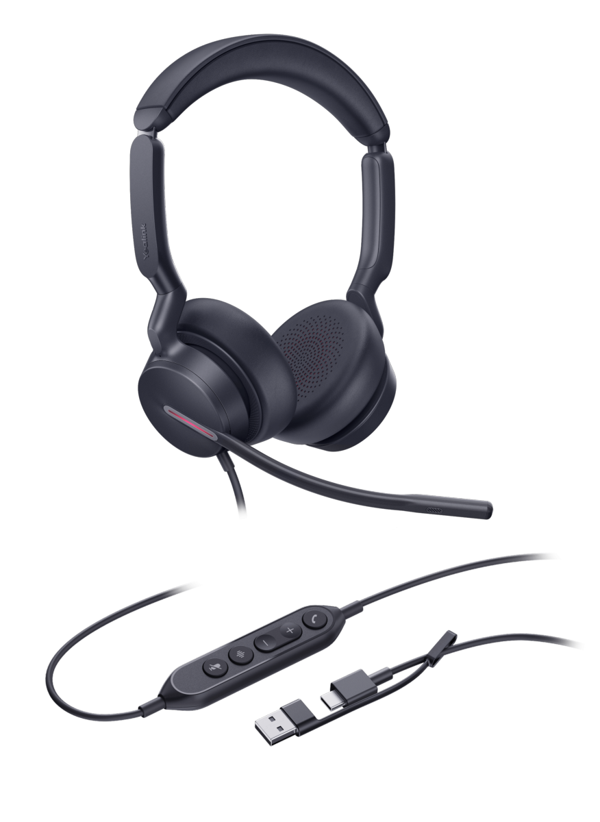 Casque téléphonique filaire avec 2 écouteurs pivotants, perche avec 3 microphones anti bruit. Connexion USB-A ou USB-C et commandes sur le câble. Optimisé pour les communications unifiées et certifié Microsoft Teams