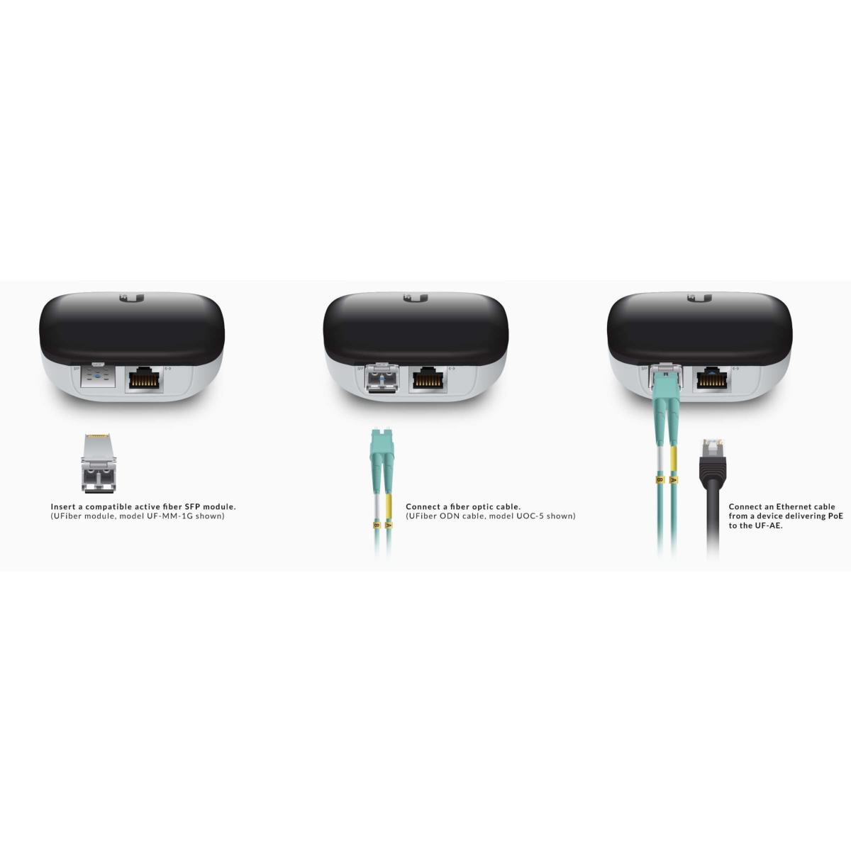 L'UF-AE fournit une connectivité fibre optique à un appareil Ethernet RJ45 qui à son tour fournit une alimentation PoE passive 802.3af ou 24V à l'UF-AE