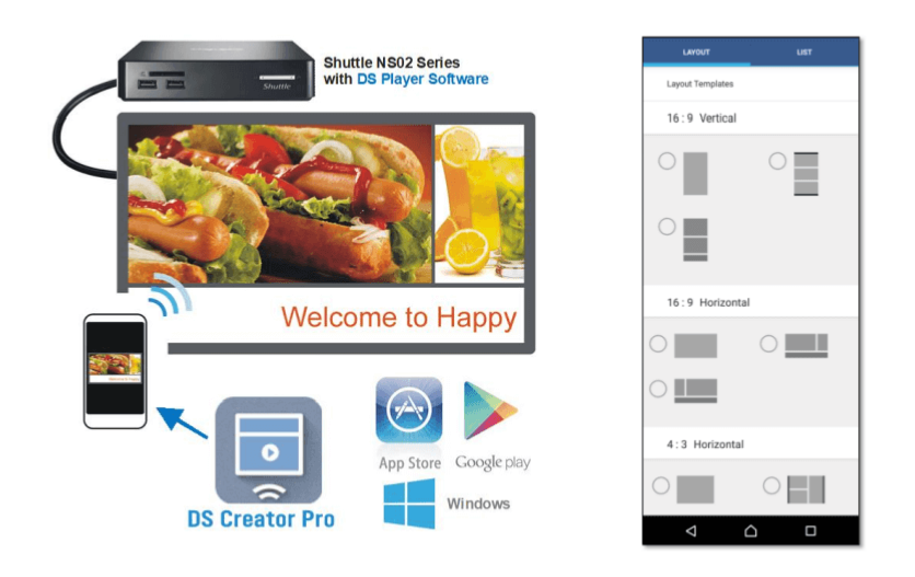 • Affichage dynamique : Logiciel pré installé Shuttle DS Player qui permet de lire un contenu d'affichage dynamique, affichage qui a été précédemment créé et uploadé avec le logiciel DS Creator