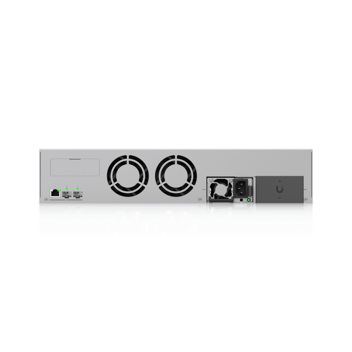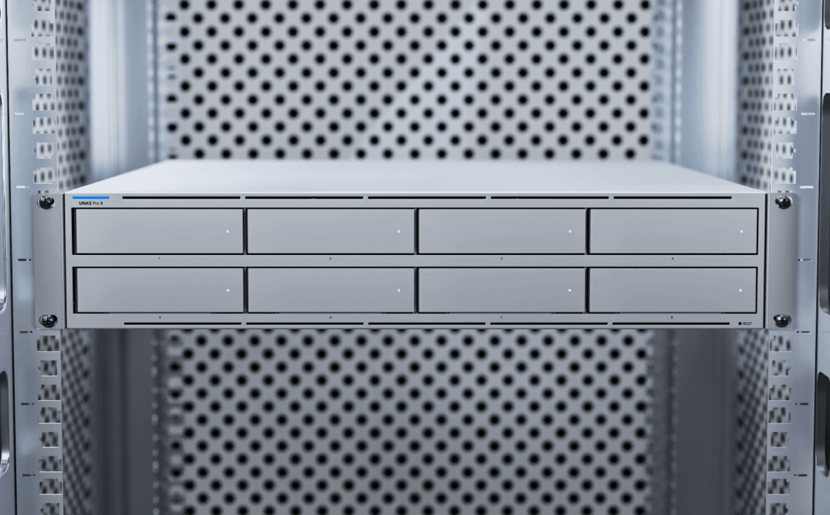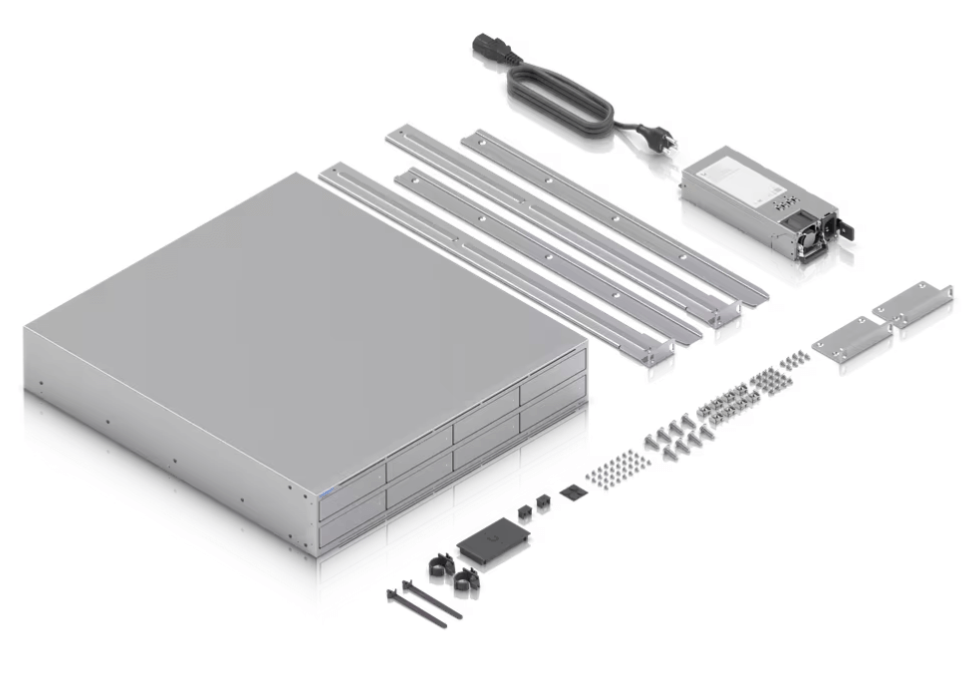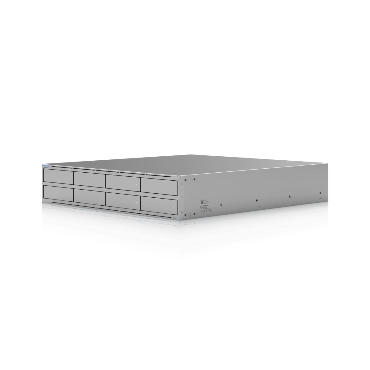 NAS rackable 19" 2U avec 8 baies pour disques durs SATA, 1 port RJ45 10 gigabits et 2 ports fibre  SFP+, 2 slots M2 NVMe, alimentation redondante. Conçu pour le stockage et le partage de fichiers à grande échelle. Gestion centralisée via UniFi Drive