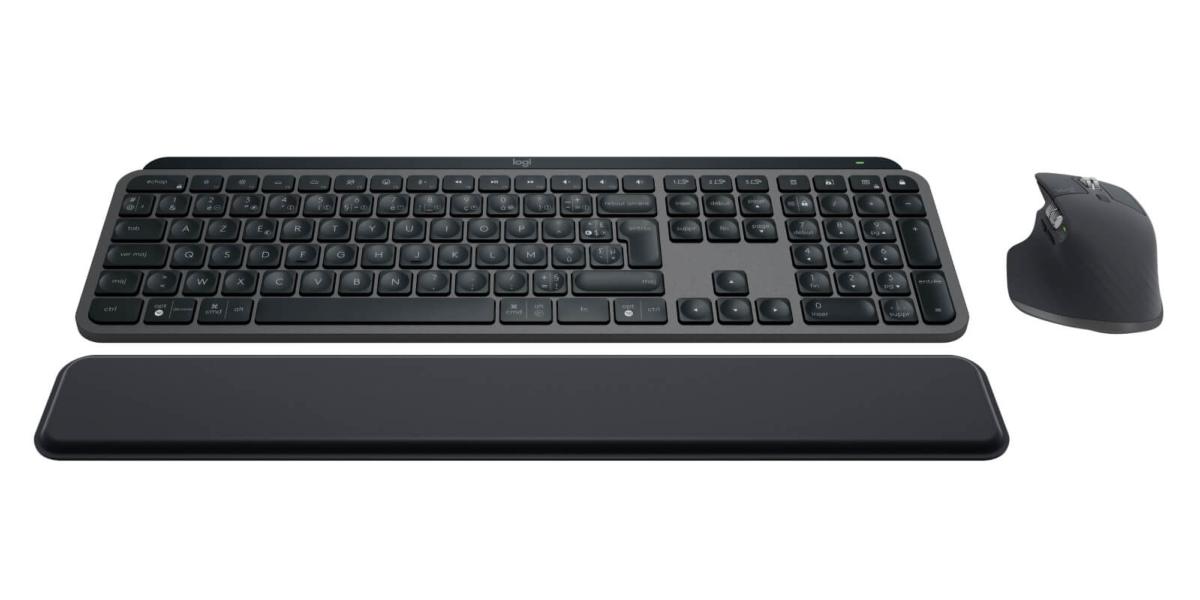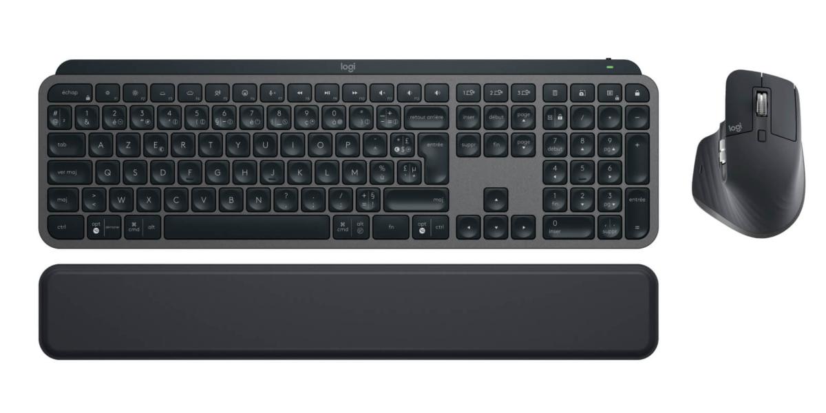 Ensemble MX For Business avec un clavier rétro éclairé Azerty FR 105 touches, pavé numérique, touches de raccourcis multimédia et souris sans fil 7 boutons pour droitier. Connexion Bluetooth et radio 2,4 Ghz avec dongle USB-A à brancher sur votre ordinateur. Couleur graphite