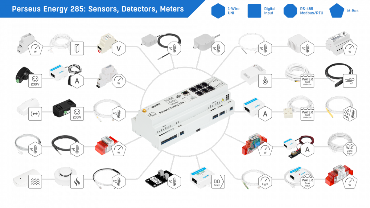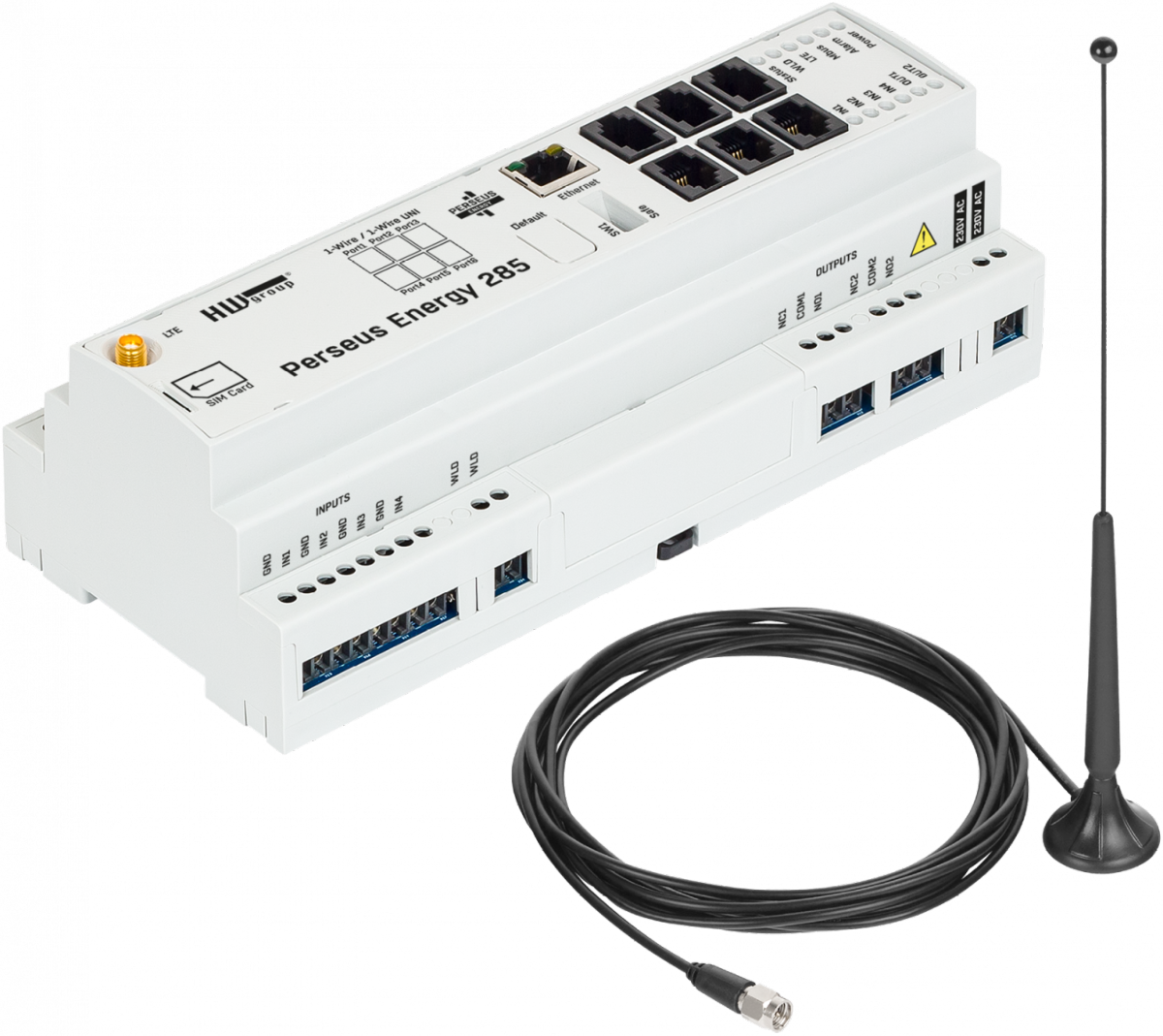il dispose de 6 ports RJ11 (1W-UNI), 4 entrées contacts secs DI, 2 sorties relai DO, 1 port pour rampe WLD, 1 port LAN, 1 bornier RS-485 et intègre un modem LTE de secours qui sert de passerelle SMS pour le Perseus lui-même ais aussi pour d'autres appareils connectés HWGroup