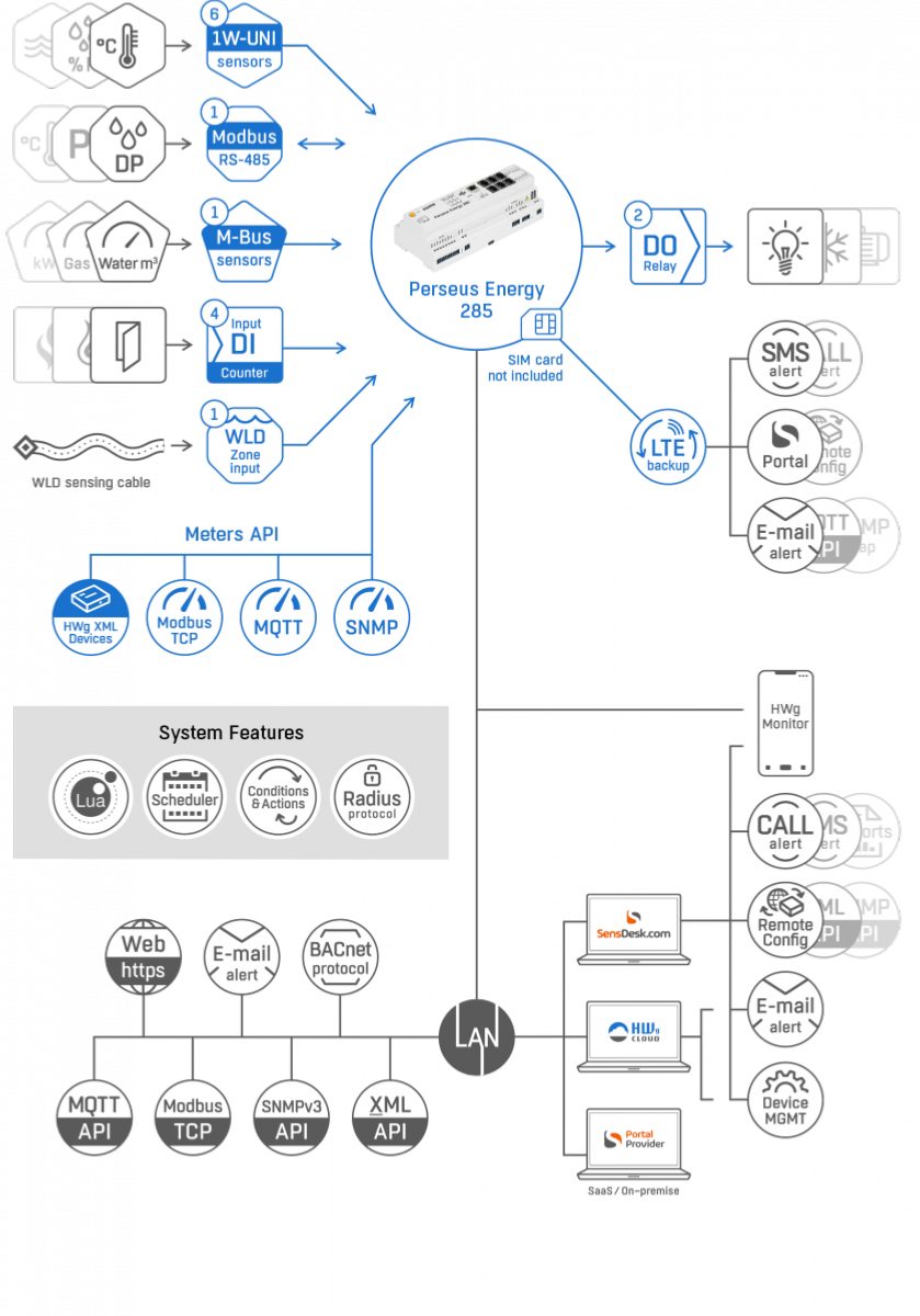 Le Perseus Energy 285 est une solution LAN et LTE sur rail DIN pour la surveillance et le contrôle à distance de l'énergie. Il permet de connecter des capteurs externes, des détecteurs ou un câble de détection d'eau WLD. Il envoie des alertes par email, SMS, trap SNMP, appel. Les valeurs mesurées sont accessibles via une API ouverte XML, Modbus/TCP, MQTT.