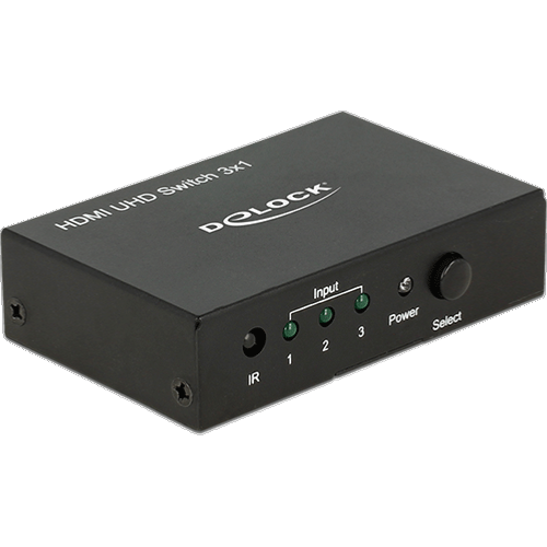 Commutateur audio vidéo Delock 3 entrées HDMI et 1 sortie HDMI. Résolution supportée jusqu'à 4K à 60 Hz. Commutation via bouton ou télécommande IR