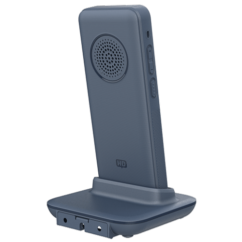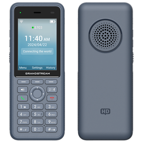 Téléphone sans fil avec 3 lignes et 3 comptes SIP,  écran LCD 2,4" couleur, interface WiFi 6 double bande et Bluetooth intégré pour appariement à un casque, 1 port USB-C de charge avec prise en charge de la charge rapide, batterie rechargeable avec une autonomie de 10 heures en conversation, bouton Push-to-talk configurable, accéléromètre et bouton d'urgence.